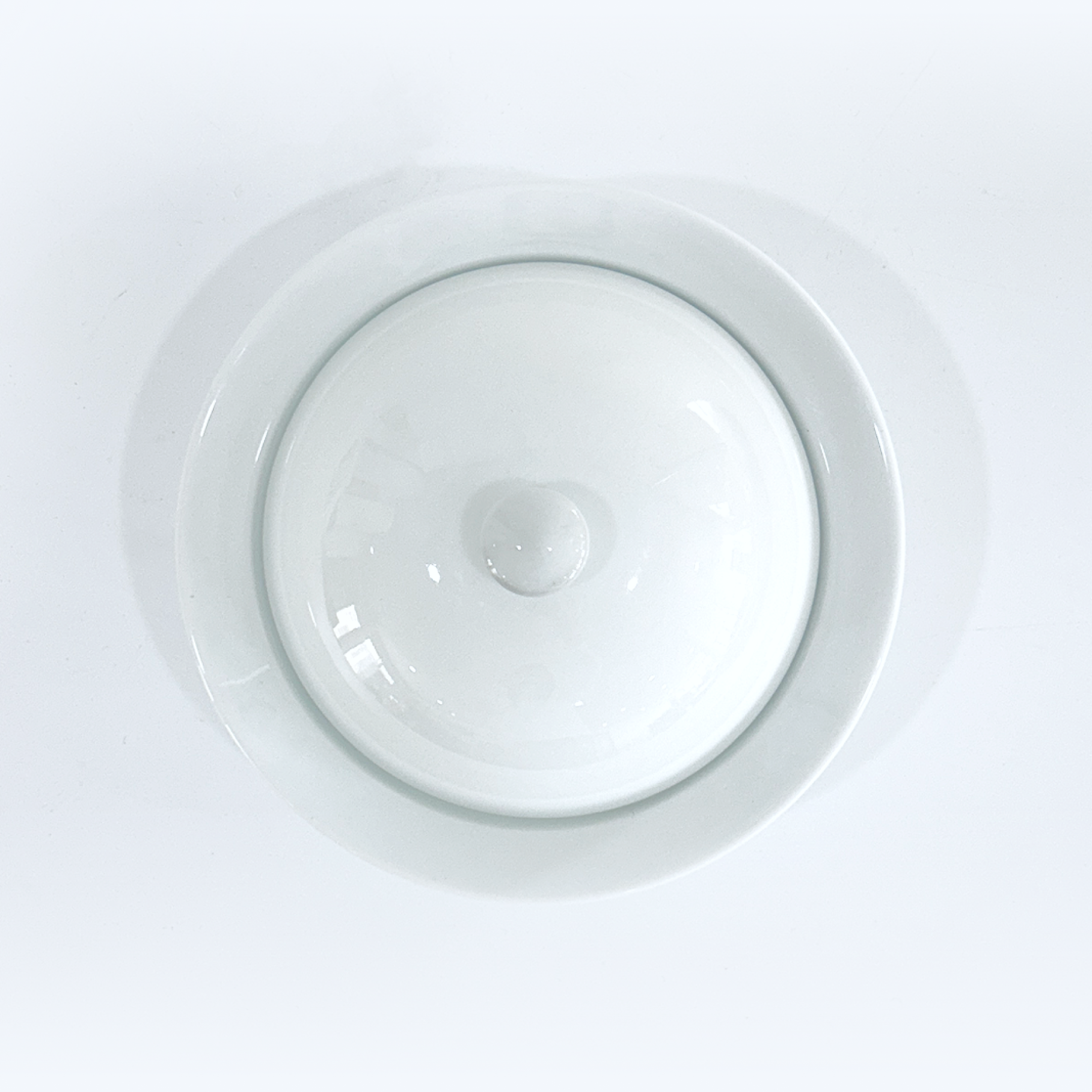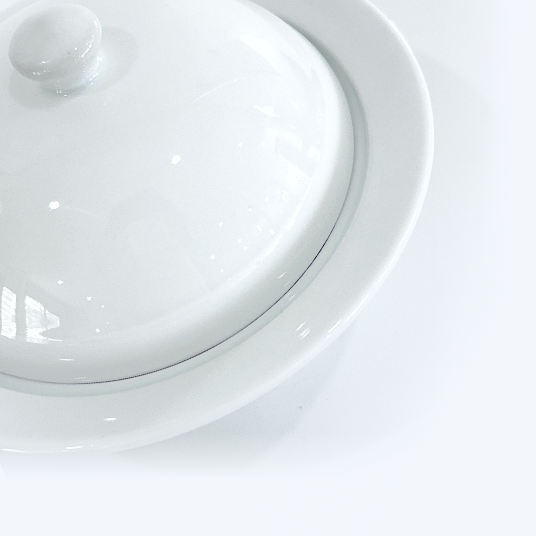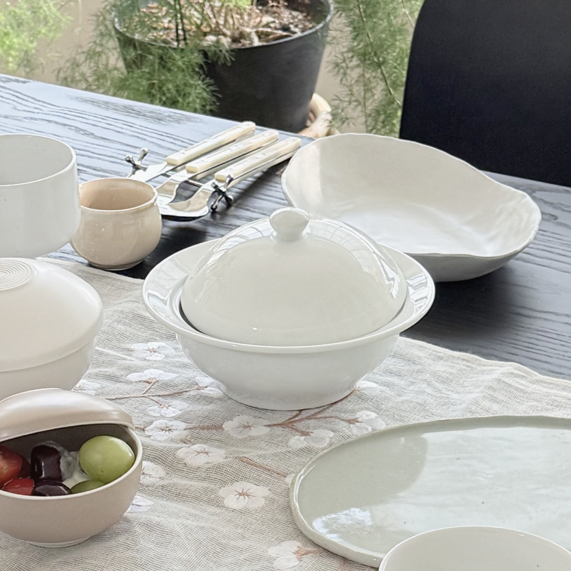 A lidded bowl with a wide rim and domed top, designed to retain warmth from kitchen to table. Finished in glossy white glaze with soft curves, it’s sized for soups, stews, risotto, or braised vegetables — a versatile piece for serving warm dishes with ease.