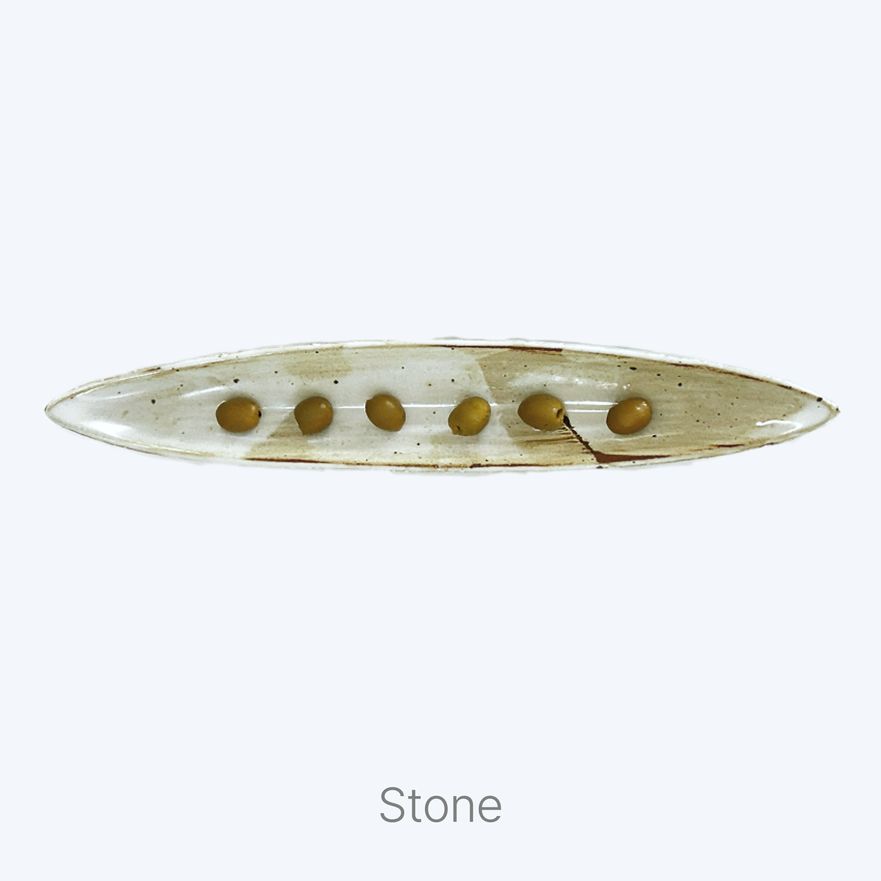 A long tray shaped with a soft, leaf-like silhouette. The flowing glaze and natural markings make each piece unique, bringing quiet beauty to the table — whether serving olives, cheese, or simply resting as a decorative object.